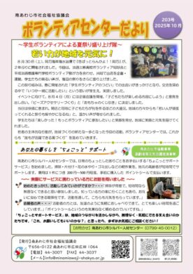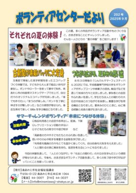 ボランティアセンターだより みなさんにボランティアに関する情報などをいち早くお伝えすることで、ボランティアをしたい方やボランティアをしてほしい方の力になりたいと思い毎月発行しています。 また、地域のみなさんに「いろいろな活動をしているボランティアがいること」を知ってもらったり、「私たちの地域にどんな力が必要なのか」を感じてもらえるようになればうれしいと思っています。このボランティアセンターだよりを通じて、地域のみなさんに”人と人とのつながり”を感じていただけるとうれしいです。 VCだよりNo.203 10月号 VCだよりNo.202 9月号 VCだよりNo.200 7月号 VCだよりNo.201 8月号 VCだよりNo.199 6月号 VCだよりNo.198 5月号 VCだよりNo.197 4月号 VCだよりNo.196 3月号 VCだよりNo.195 2月号 VCだよりNo.194 1月号 2025年 2024年