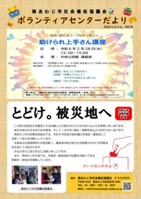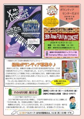 ボランティアセンターだより みなさんにボランティアに関する情報などをいち早くお伝えすることで、ボランティアをしたい方やボランティアをしてほしい方の力になりたいと思い毎月発行しています。 また、地域のみなさんに「いろいろな活動をしているボランティアがいること」を知ってもらったり、「私たちの地域にどんな力が必要なのか」を感じてもらえるようになればうれしいと思っています。このボランティアセンターだよりを通じて、地域のみなさんに”人と人とのつながり”を感じていただけるとうれしいです。 VCだよりNo.193.12月号 VCだよりNo.192.11月号 VCだよりNo.191.10月号 VCだよりNo.190.9月号 VCだよりNo.189.8月号 VCだよりNo.188.7月号 VCだよりNo.187.6月号 VCだよりNo.186.5月号 VCだよりNo.185.4月号 VCだよりNo.184.3月号 VCだよりNo.183.2月号 VCだよりNo.182.1月号 2025年 2024年 2023年